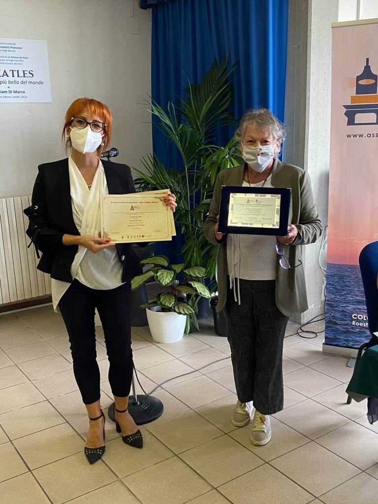Quest’anno il nostro premio è stato attribuito a un’opera poetica di Grazia Di Lisio, ritratta nella foto mentre riceve il premio da parte della Giurata, la poetessa e scrittrice Sara Palladini.