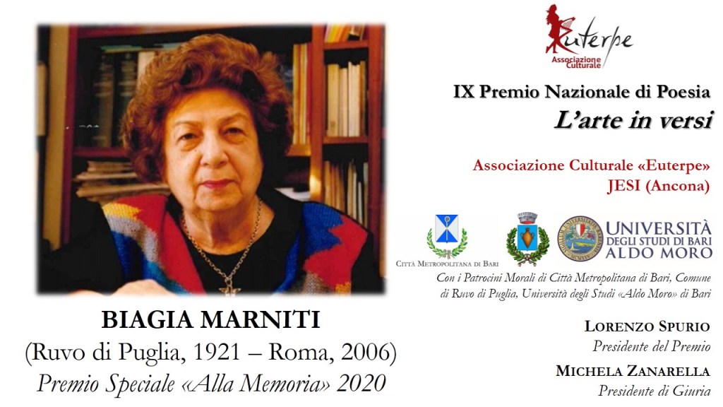 • PREMIO SPECIALE “ALLA MEMORIA” conferito alla poetessa BIAGIA MARNITI, nome d’arte di BIAGIA MASULLI (Ruvo di Puglia, 1921 – Roma, 2006) e al poeta lombardo SIMONE CATTANEO (Saronno, 1974 – 2009)