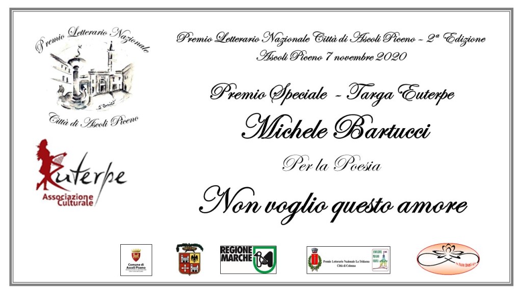 Il Premio Speciale, la “Targa Euterpe”, offerto dalla nostra Associazione, è stato attribuito, in base alle deliberazioni della Commissione di Giuria e del Presidente del Premio al poeta Michele Bartucci di Grottammare (AP) con la poesia “Non voglio questo amore”. A continuazione si riporta il testo vincitore e la motivazione critica per il conferimento stilata dal Presidente dell’Associazione Culturale Euterpe Lorenzo Spurio.
