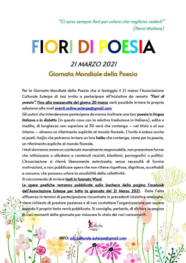 Per la Giornata Mondiale della Poesia che si festeggia il 21 marzo l’Associazione Culturale Euterpe di Jesi invita a partecipare all’iniziativa da remoto “Fiori di poesia”. Fino alla mezzanotte del giorno 20 marzo sarà possibile inviare la propria adesione alla mail eventi.online.euterpe@gmail.com