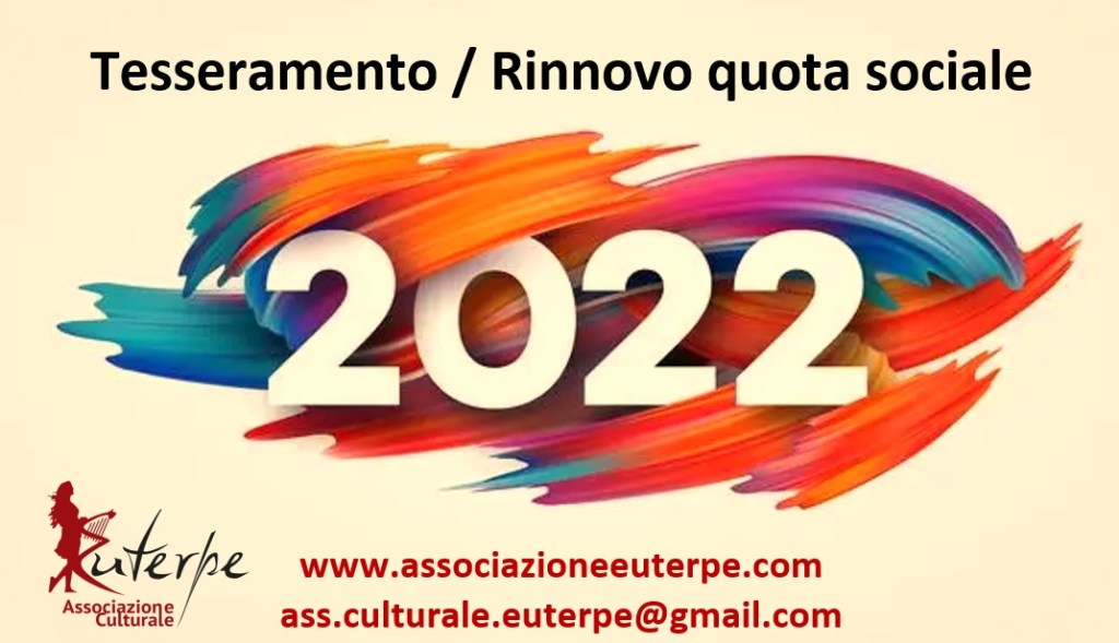 1)     Per coloro che nel 2021 non avevano adempiuto al rinnovo della loro quota sociale, possono – se vogliono – mantenere il loro status di socio provvedendo a una nuova iscrizione. Unitamente alla quota sociale dovranno, pertanto, far pervenire alla mail: ass.culturale.euterpe@gmail.com, oltre alla ricevuta della quota, la scheda d’iscrizione (scaricabile a questo link: https://drive.google.com/file/d/1UqSs1JJcivoJjiWK5UQVJVttVSgQkJf3/view)