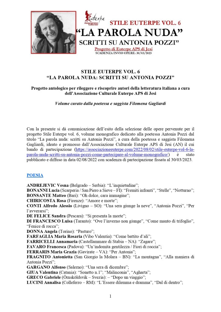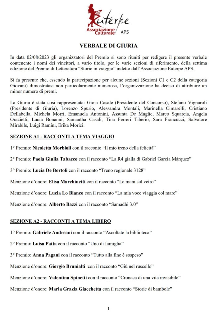 Ai sensi del D.Lgs 196/2003 e del Regolamento Generale sulla protezione dei dati personali n°2016/679 (GDPR) il partecipante acconsente al trattamento, diffusione e utilizzazione dei dati personali da parte di Euterpe APS che li utilizzerà per i fini inerenti al concorso in oggetto e per iniziative culturali e letterarie analoghe organizzate dalla stessa.