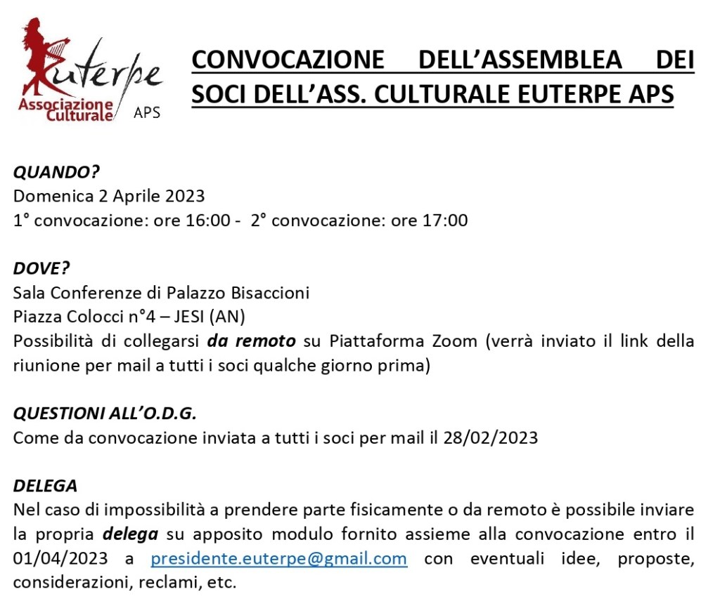 È fatto divieto di partecipare, pena l’esclusione, ai soci fondatori, ai soci onorari, ai Consiglieri (in carica o passati) di Euterpe APS e ai Presidenti di Giuria attivi o passati del presente premio.